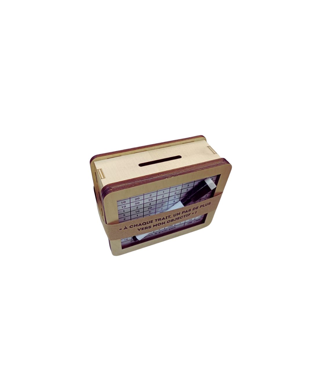 Le feutre fourni permet de cocher chaque montant inséré, et un petit orifice avec capuchon permet de récupérer vos économies.